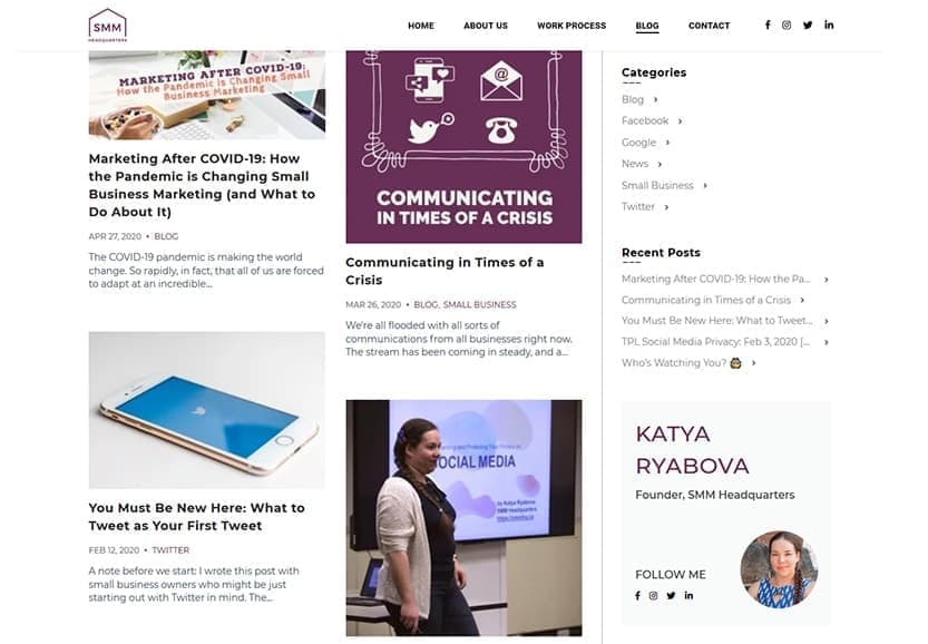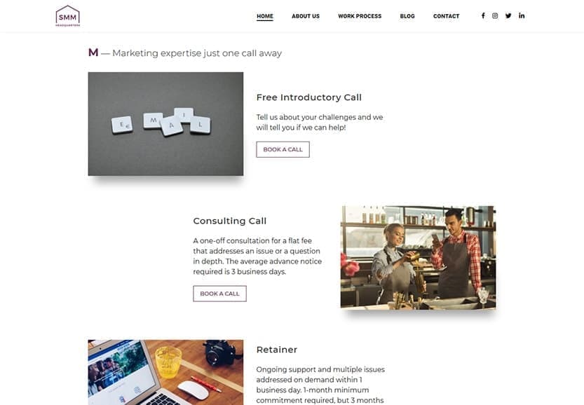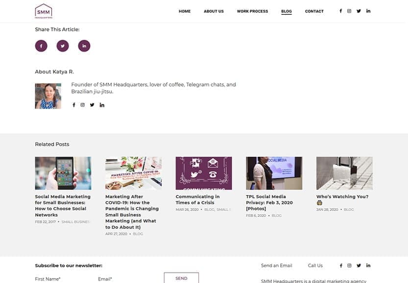 The website development project for SMM Headquarters had the standard requirements of building a site that would be functional and easy on the eyes. In addition, it also had some very specific marketing components we needed to account for. Email marketing integrations such as a newsletter sign-up forms were required, along with dynamic social media widgets. The client also stressed the importance of having website loading speeds up to modern standards. Because her old website was extremely slow to load, her Google rankings suffered as a result.